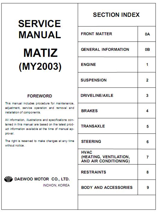 DAEWOO MATIZ 1998-2005, SERVICE, REPAIR MANUAL